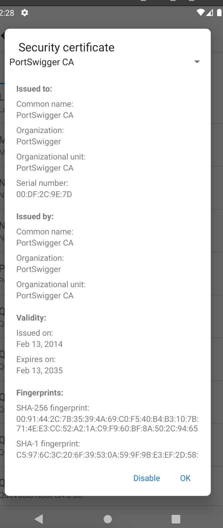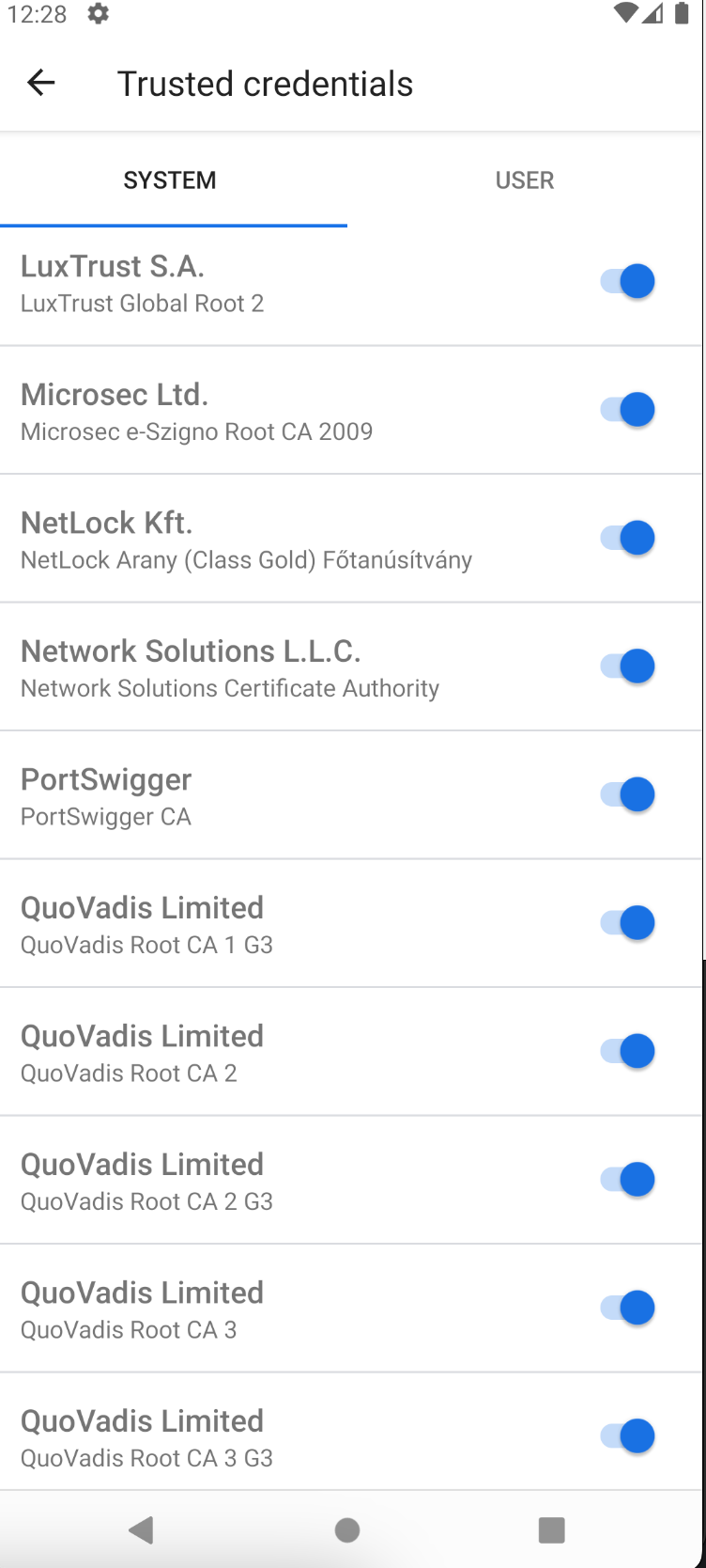 Once the above commands are executed and the phone reboots, you will see your Portswigger CA installed on the phone, just like in the old times: